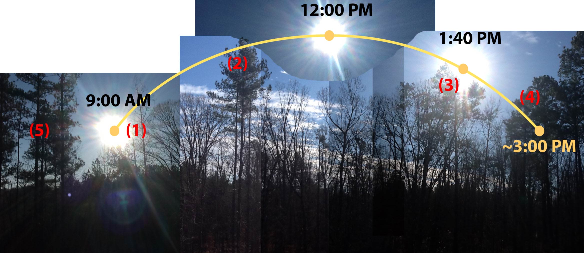 Here’s a panorama of our southern exposure around mid-winter. Due to cloud cover at the wrong times and a vacation trip, these images were taken between December 19th – 29th, 2011. I’ve overlaid a rough solar path, projected out to 3p. The solar calculators assume unobstructed solar exposure occurs between 9a and 3p every day. As you can see, this is not true for us.